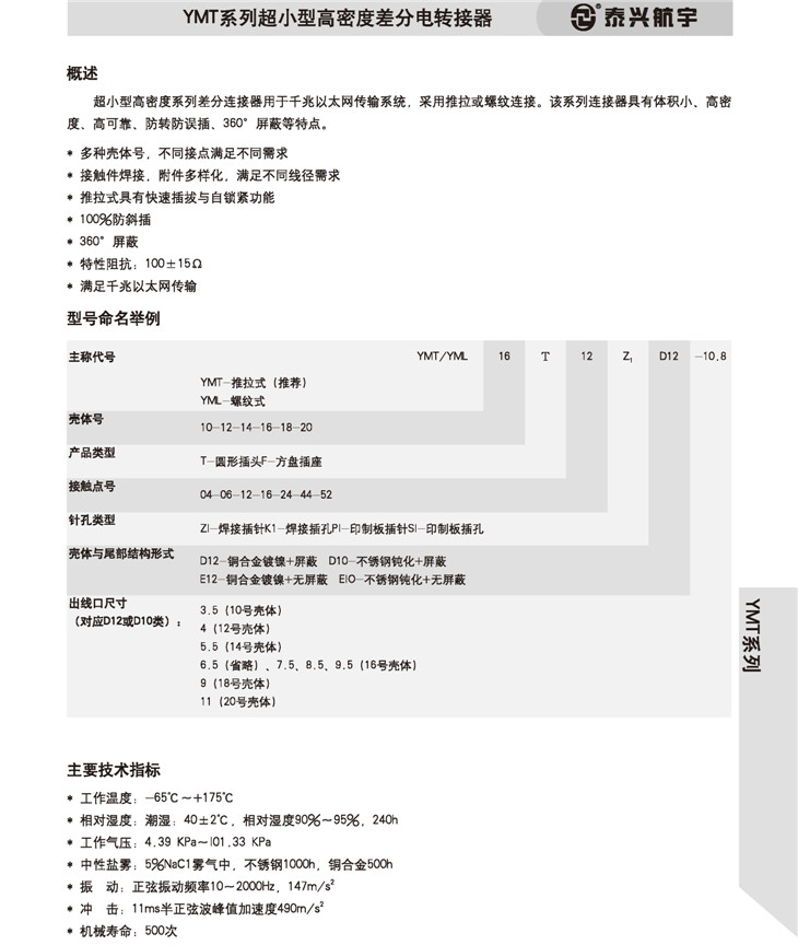YMT系列超小型高密度差分電轉(zhuǎn)接器超小型高密度系列差分連接器用于千兆以太網(wǎng)傳輸系統(tǒng),采用推拉或螺紋連接。該系列連接器具有體積小。高密度、高可靠、防轉(zhuǎn)防誤插、360* 屏蔽等特點(diǎn)。